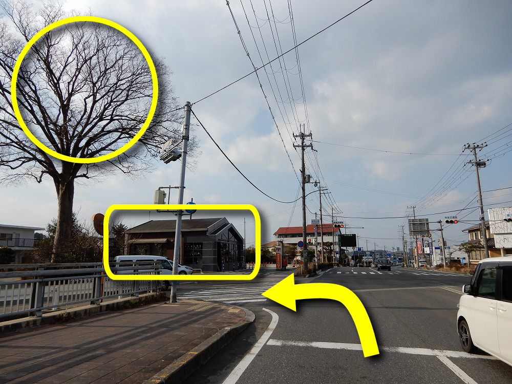①「新明治橋」の信号を左折します。(山口郵便局と、大きな木が目印です)